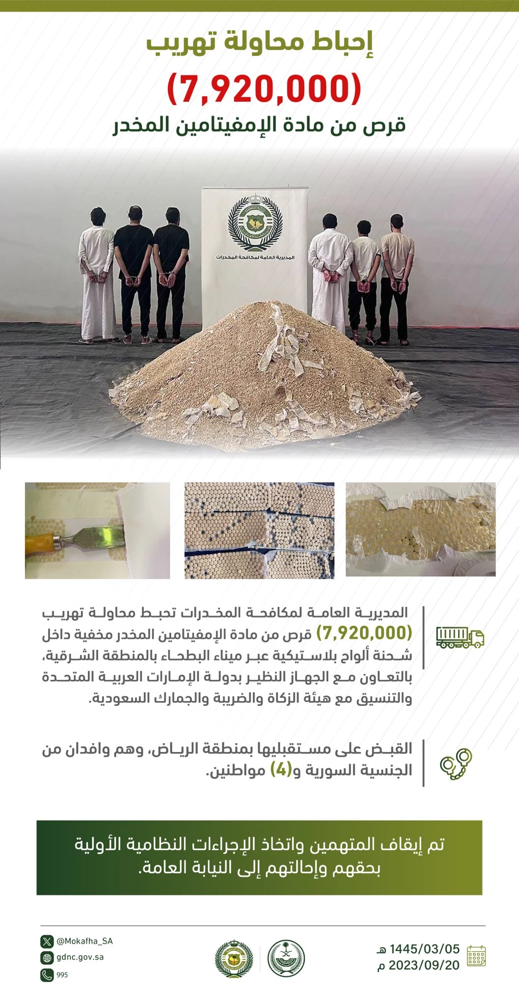 وقالت وسائل الإعلام السعودية إن الكمية المضبوطة وهي من مادة الأمفيتامين المخدر كانت مخفية داخل شحنة ألواح بلاستيكية، وتم ضبطها بالتعاون مع مكافحة المخدرات بدولة الإمارات، والتنسيق مع هيئة الزكاة والضريبة والجمارك السعودية.