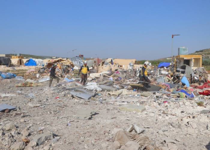 وقالت مصادر محلية ، إن 5 مدنيين (طفلان و3 نساء) قُتلوا اليوم الثلاثاء، كحصيلة أولية، بالإضافة إلى جرح 8 مدنيين آخرين بينهم نساء وأطفال، غالبيتهم نازحون من قرية الصحن في منطقة جسر الشغور بريف إدلب الغربي، إثر استهداف الطائرات الحربية الروسية بعدة غارات جوية مخيماً للنازحين (مخيم أهل سراقب) عند مفرق قرية الحمامة القريبة من مدينة جسر الشغور بريف إدلب الغربي.