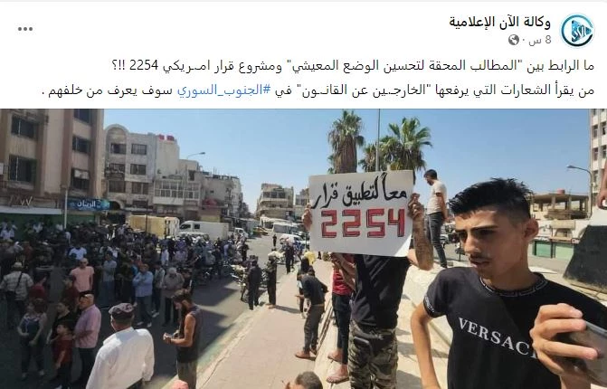 وقالت الوكالة في منشور على حسابها الرسمي بـ”فيسبوك”: “ما الرابط بين المطالب المحقة لتحسين الوضع المعيشي ومشروع قرار أمريكي 2254”.