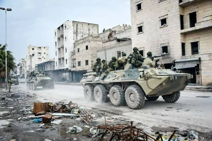ونشرت صفحة القناة المركزية لقاعد حميميم العسكرية، صورا لعناصر القوات الروسية والمدرعات العسكرية، وهي تنتشر في أحياء المدينة الشرقية المدمرة، ومحيط مطار حلب الدولي.