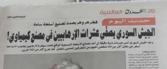 ونشرت صحيفة “الشروق”، القريبة من حزب نداء تونس الذي يتزعمه الرئيس الباجي قايد السبسي، في طبعتها الورقة، خبراً تحت عنوان “الجيش السوري يصفي عشرات الإرهابيين في مصنع كيماوي”.
