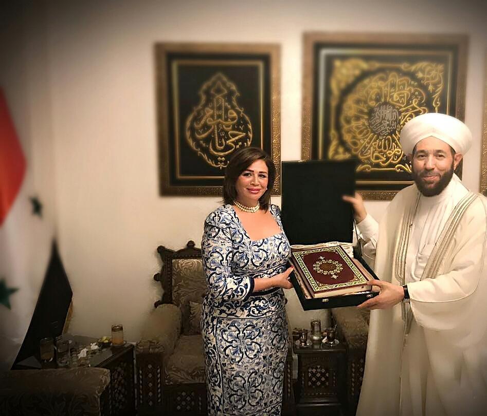 نشرت الممثلة المصرية إلهام شاهين على صفحتها بإنستغرام، صورة جمعتها بمفتي سوريا الشيخ أحمد بدر الدين وهو يقدم إليها مصحفاً هديةً.