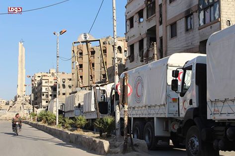 دخلت عصر أمس الثلاثاء، قرابة ال 55 سيارة تحمل مساعدات من قبل الأمم والمتحدة والهلال الأحمر السوري، الى المناطق التي تحاصرها قوات النظام السوري، في الغوطة الشرقية، (حمورية -سقبا -حزة -بيت سوى)، وذلك بحماية من جيش الإسلام وقيادة الشرطة