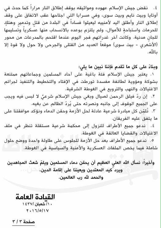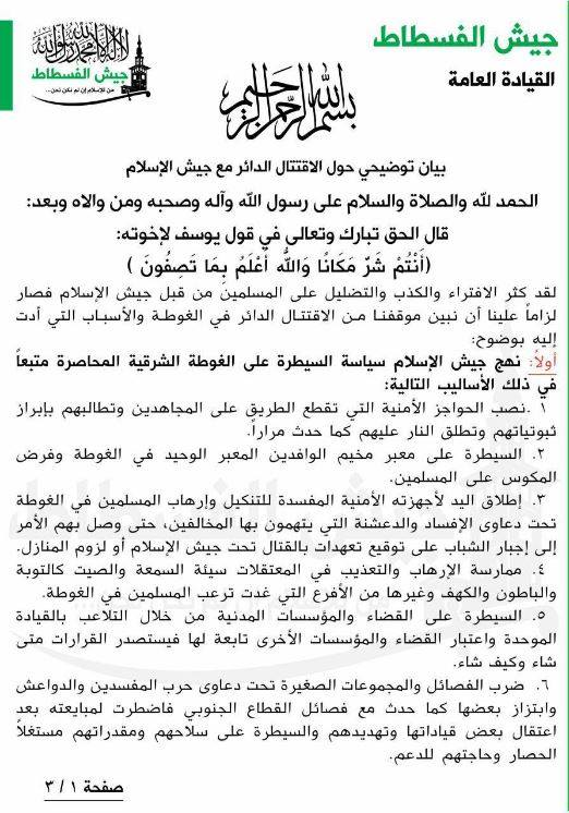 وبحسب البيان فإن جيش الإسلام سيطر على معبر مخيم الوافدين المعبر الوحيد في الغوطة، وأطلق اليد لأجهزته الأمنية المفسدة للتنكيل وإرهاب المسلمين في الغوطة بدعوى الإفساد حتى وصل الأمر إلى إجبار الشباب على توقيع تعهدات بالقتال تحت راية جيش الإسلام أو لزوم المنازل.