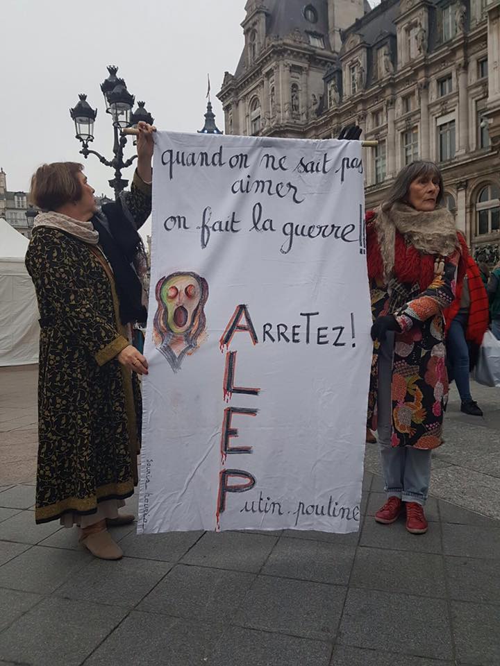 خاص | قالت الفنانة السورية “فدوى سليمان” , من على منبر خصصته بلدية باريس الثانية , وضم العشرات من السياسيين والبرلمانيين الفرنسيين واكثر من 63 منظمة مجتمعية وسياسية ومدنية وطبية, وأبناء الجالية السورية والمئات من الشعب الفرنسي عشية يوم السبت 10كانون الأول/ ديسمبر , خلال وقفة نظمتها حركة (نسكن) , الثورية تحت عنوان ” أنقذوا حلب ,أنقذوا إنسانيتكم ” , والتي دعمتها بلدية باريس : ” لاتقبلو أي تحية بعيد الميلاد ورأس السنة ممن يقتل السوريين في مدينة حلب ” .d3552634-f510-40be-91a4-9261c89b618b