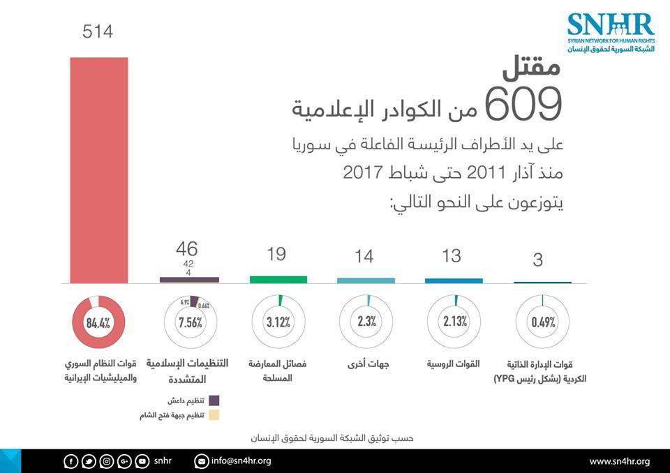 وثقت الشبكة السورية لحقوق اﻹنسان في تقرير لها مقتل 609 من الكوادر اﻹعلامية في سوريا، منذ بداية الثورة السورية في آذارمن عام 2011 وحتى شهر شباط من العام الجاري.