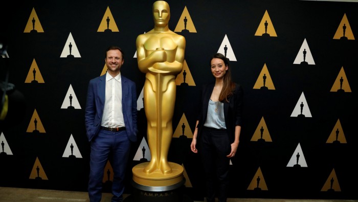 89th Academy Awards – Oscars Backstage – Hollywood, California, U.S. – 26/02/17 – Orlando von Einsiedel and Joanna Natasegara hold their Oscars for Best Documentary Short Subject for “The White Helmets”. REUTERS/Lucas Jackson