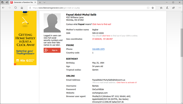موقع Fake Name Generator يمكنك استخدامه إذا كنت ترغب فى إنشاء حساب جديد على إحدى المواقع على الإنترنت أو في اي مكان يطلب منك إدخال بياناتك الشخصية، فإذا كنت لا تريد كتابة معلومات حقيقية عنك، سيساعدك هذا الموقع على إنشاء شخصية غير حقيقية حيث يمنحك اسم وعنوان وتاريخ ميلاد ورقم هاتف وتفاصيل مالية جميعها مزيفة إلا البريد الإلكتروني هو الشيء الوحيد الحقيقي وذلك حتى تستقبل عليه الرسائل الالكترونية. هذه تعتبر طريقة جيدة إذا كنت لا تريد مشاركة التفاصيل الخاصة بك عبر الإنترنت.