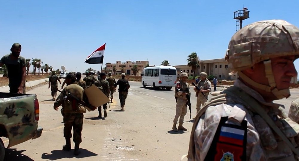 وكان شهود أفادوا بأن مركبات تابعة (للحكومة السورية) ترافقها الشرطة العسكرية الروسية دخلت منطقة في مدينة درعا يوم الخميس من أجل رفع العلم.