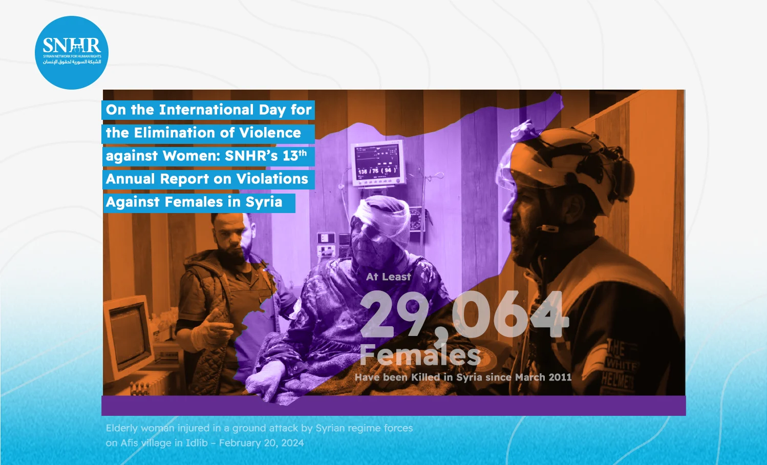 Dans un rapport publié à l’occasion de la Journée internationale pour l’élimination de la violence à l’égard des femmes, le Réseau syrien pour les droits de l’homme (SNHR) a documenté les graves atteintes aux droits des femmes perpétrées depuis le début du conflit en Syrie en mars 2011. Ces violences, aux répercussions profondes sur le tissu social syrien, incluent des assassinats, des disparitions forcées, des actes de torture et des violences sexuelles.