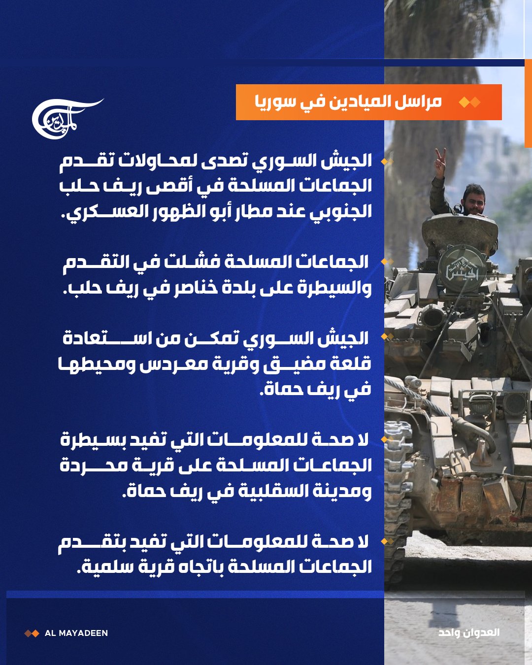 حين يتعلق الأمر بمعارك ميليشيات الأسد، تتحول الميادين إلى ماكينة دعائية تروج لانتصارات وهمية. في تغطية معركة “ردع العدوان”، ادعت القناة أن قوات النظام “تصدّت ببسالة” لمقاتلي الثورة، بينما كانت التقارير الميدانية وشهادات الناشطين تؤكد انسحاب ميليشيات الأسد أمام ضربات الثوار.
