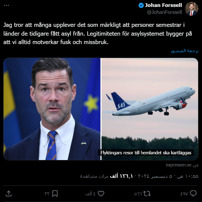 أعلنت الحكومة السويدية تكليف وكالة الهجرة بالتعاون مع الشرطة والسفارات بتعقب رحلات اللاجئين الذين يحملون تصاريح إقامة إلى بلدانهم الأصلية. الخطوة تأتي لضمان عدم إساءة استخدام صفة اللجوء، حيث أكد وزير الهجرة السويدي، يوهان فورسيل، أن عودة اللاجئين إلى بلدانهم الأصلية، التي فروا منها طلباً للحماية، تثير تساؤلات حول مصداقية طلباتهم وحاجتهم الفعلية للجوء.