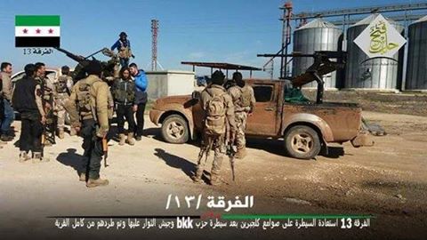 أعلنت الفرقة 13 مشاة المقاتلة في صفوف المعارضة السورية، مساء أمس استعادة سيطرتها على صوامع الحبوب في قرية كلجبرين شمالي مدينة تل رفعت في ريف حلب الشمالي.