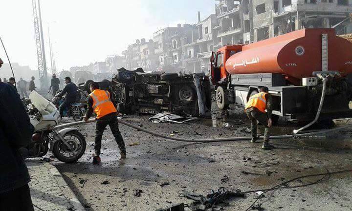 من جهتها، أعلنت وسائل إعلام النظام أن تفجيراً إرهابيا مزدوجا، ضرب الحي وأدى لسقوط قتلى وجرحى، في معلومات أولية عن الحادثة.