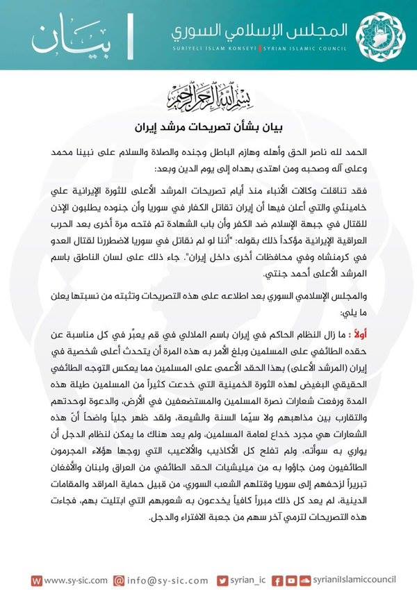 بعد تصريحات من يدعى المرشد الأعلى للثورة الإسلامية “علي خامنئي” التي اعتبرت أن إيران تقاتل الكفار في سوريا، أصدر المجلس الإسلامي السوري بيانًا للرد على ذلك.