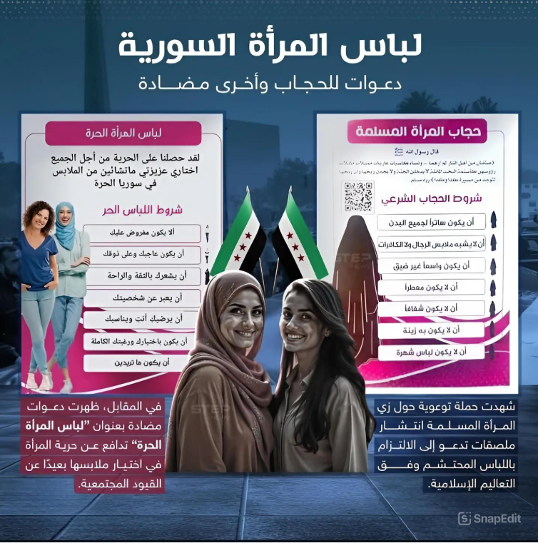 شهدت شوارع العاصمة السورية دمشق خلال الأيام الماضية نقاشاً محتدماً على وسائل التواصل الاجتماعي، إثر انتشار ملصقات متضاربة تدعو إلى مواقف متباينة حول لباس المرأة.