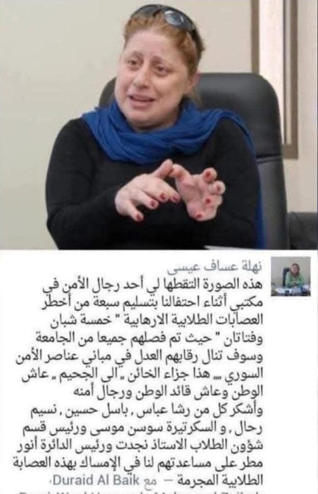 أحد الطلاب عبّر، في تصريح لـ تلفزيون سوريا، عن استيائه من استمرار شخصيات أكاديمية معروفة بولائها للنظام السابق في مواقعها، رغم سقوطه. وذكر أن من بين هؤلاء الدكتورة نهلة عيسى، التي ما تزال تمارس عملها رغم سجلها الحافل بالمخالفات.