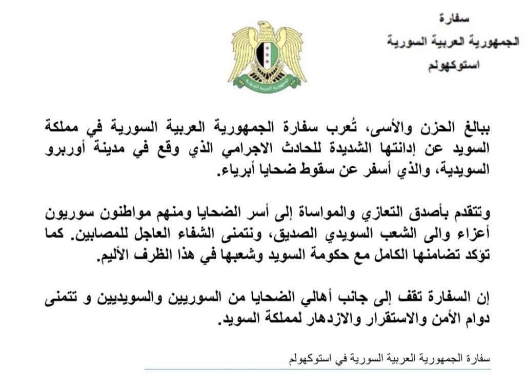 السفارة السورية في السويد تدين الهجوم الإجرامي في أوربرو