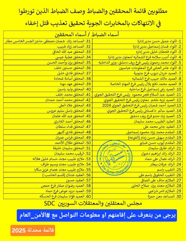 اللواء جميل حسن – اللواء غسان إسماعيل – اللواء قحطان خليل – اللواء أديب سلامة – اللواء محمد خالد رحمون – اللواء سامر إسماعيل – العميد دريد درويش – العقيد فادي خليل – العقيد جهاد بركات – العقيد عدنان حلوة – العميد الركن محمود خليل – العقيد محمد خلف – العقيد محمد ديب خلوف – العميد أحمد عسكر – العميد الطيب محمد سليمان – العقيد جابر محمد علي – العقيد زياد محمود إسماعيل – العقيد سهيل زمان (القوقعة) – المقدم أيوب حسن علي – المقدم حسن دياب – الرائد رائد زكريا يونس – الرائد فضل علي سليمان – الرائد يزن محمد سليمان – النقيب الحقوقي باسم علي – الملازم مناف علي الحسن – الملازم خلدون صلاح الجلي – الملازم علي حسن – العميد رضوان صفران – العميد دريد عوض – العميد فؤاد سليمان – المساعد أول شعبان مصطفى – المساعد أول رائد يحيى – المحقق عبد الله الحاجي – المحقق عيطة عيسى – المحقق علي حسن الحسين – المحقق محمد سعيد – المحقق غياث طراف – المحقق جهاد سليمان – المحقق فادي خلف – المحقق محمود محمود خليل – المحقق محمد ديب خلف – المحقق محمد قاسم – المحقق محمد خضور – المحقق محمد علي عيسى – المحقق أحمد المقدري – المحقق فادي سلطان – المحقق فادي كرم – المحقق مؤيد حسن – المحقق عبد الكريم – المحقق طلال الأحمد – المحقق نور الدين سليمان – المحقق مهند حسام خليل هلاله – المحقق محمد وسيم طارق – المحقق هشام عصام عزت سبايا – العقيد عدنان (أبو الحسن الساحلي) – النقيب الحسن – العقيد حسن.