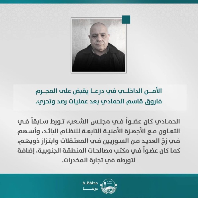 تمكنت قوى الأمن الداخلي في درعا من إلقاء القبض على فاروق قاسم الحمادي، بعد عمليات رصد وتحري دقيقة. ويعد الحمادي شخصية بارزة في المحافظة، حيث كان عضوًا سابقًا في مجلس الشعب السوري، وعُرف بتعاونه الوثيق مع الأجهزة الأمنية التابعة للنظام البائد.