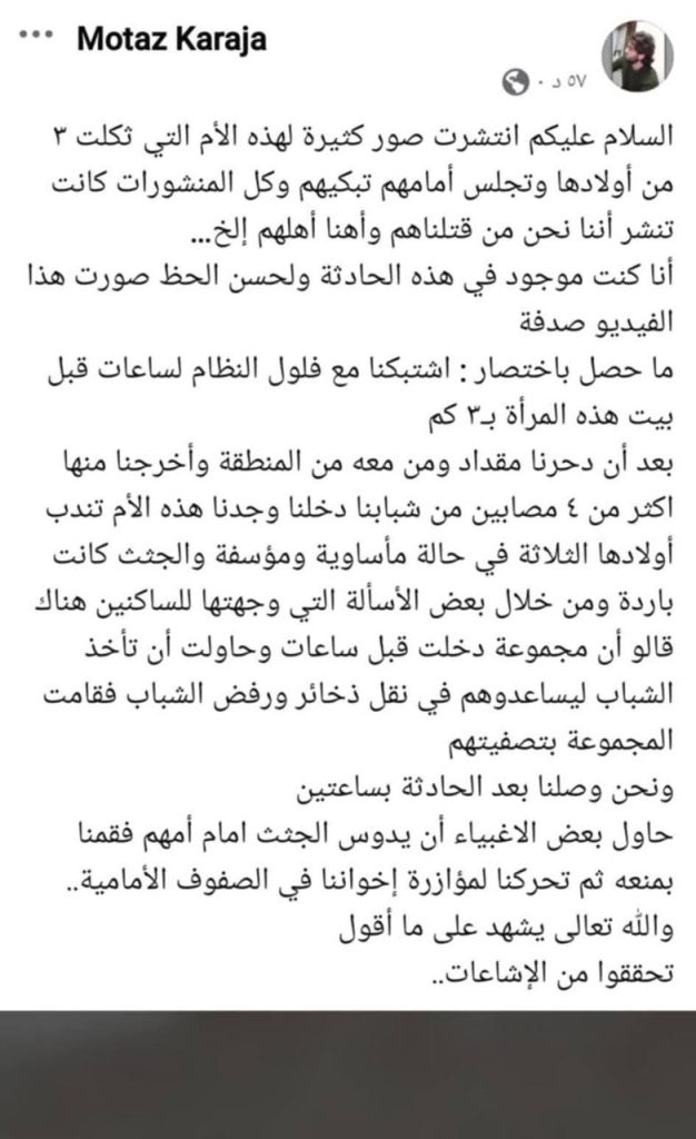 أنا كنت موجوداً في نفس الحادثة وصوّرت هذا الفيديو، وما حصل باختصار هو أنّ اشتباكاً وقع مع فلول النظام، وتمّ تأمين المنطقة وإخراج المصابين. بعد ذلك، ظهرت الأمّ في المقطع وهي في حالة انهيار أمام جثث أبنائها، لكن لم تكن هناك أيّ دلائل على مسؤولية الجيش السوري أو الأمن العام عن مقتلهم.