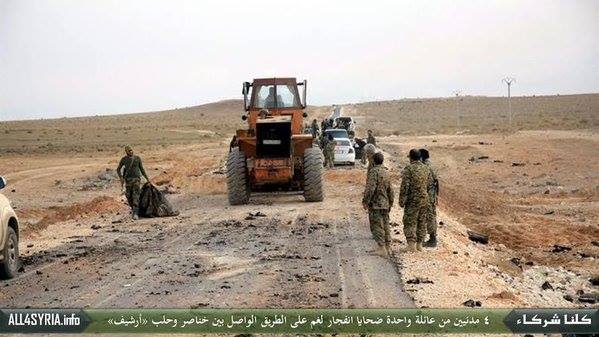 استشهد أربعة مدنيين من عائلة واحدة وجرح العشرات إثر انفجار عبوة ناسفة أثناء مرورهم مساء أمس قرب بلدة “خناصر” على الطريق الوحيد الذي يربط مدينة حلب بباقي المحافظات السورية.