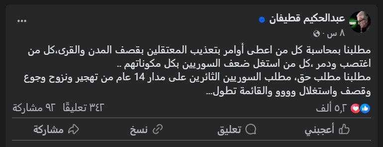 طالب الفنان السوري عبد الحكيم قطيفان، عبر منشورات له على صفحته الرسمية في “فيسبوك”، بمحاسبة كل من ارتكب جرائم بحق الشعب السوري، وعلى رأسهم “الشبيحة”، مشدداً على أن مطلب المحاسبة ما يزال قائماً بعد 14 عاماً من الحرب.