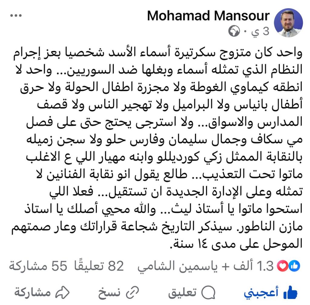 من جهته، كان حجو قد أعرب عن اعتراضه على قرار نقابة الفنانين بشطب عضوية سلاف فواخرجي، معتبرًا أن النقابة “لا تمثله” وأن إدارتها الحالية “يجب أن تستقيل”.