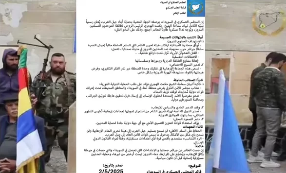 أصدر مايسمى بـ “المجلس العسكري في السويداء” امس بياناً صادماً تبنّى فيه بالكامل مطالب الرئيس الروحي للطائفة الدرزية، الشيخ حكمت الهجري، ورفض بشدة بيان مشيخة العقل الصادر أمس.