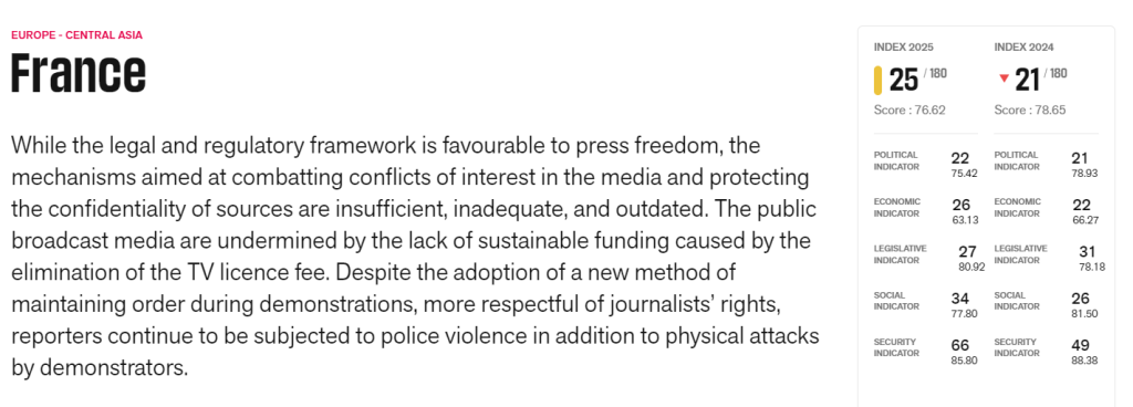 La France occupe la 26ᵉ place sur 180 pays dans l’indice mondial de la liberté de la presse 2025, avant-dernière des démocraties européennes, dans un contexte jugé « difficile » pour l’ensemble du continent.