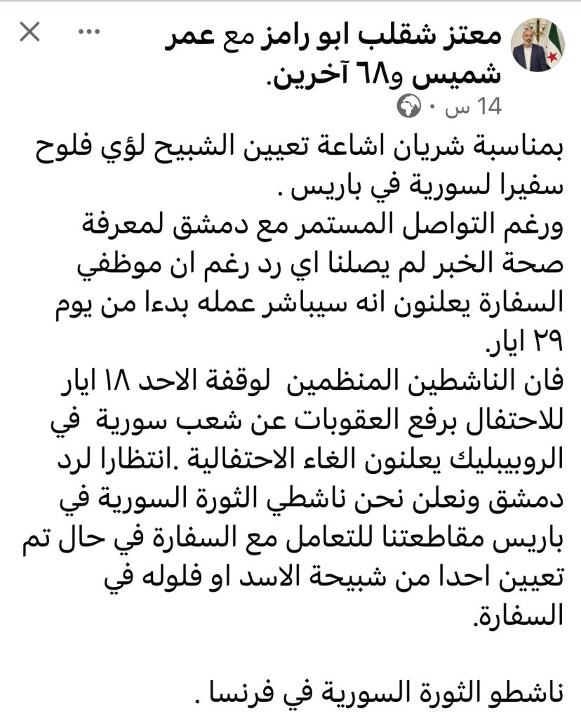 أصدر مجلس الوزراء السوري قراراً بتعيين الدكتور لؤي فلوح، المعروف بتصريحاته الممجدة للنظام البائد ومواقفه الرافضة للثورة السورية، سفيراً للجمهورية العربية السورية في باريس.