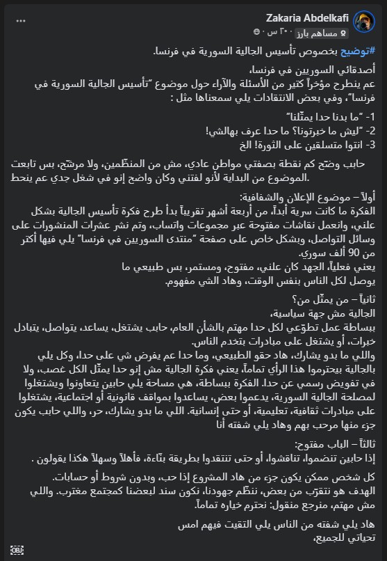 ودعا آخرون إلى تجميد أي خطوات تنظيمية رسمية حتى يتم فتح نقاش جاد وشفاف يشمل جميع أطياف الجالية السورية في فرنسا، بما يضمن تأسيس كيان جامع فعلاً لا يعيد إنتاج الإقصاء باسم العمل التطوعي أو المبادرات المجتمعية.