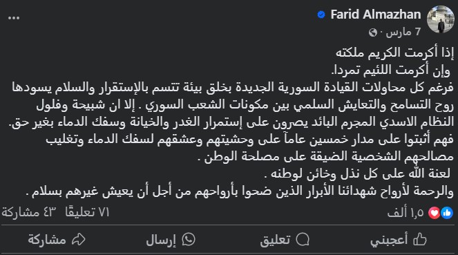 وختم المذهان منشوره بالدعاء بالرحمة لشهداء سوريا، مؤكدًا أن الشعب لن يسمح بإعادة إنتاج “نظام الإجرام والاستبداد” تحت أي مسمى.