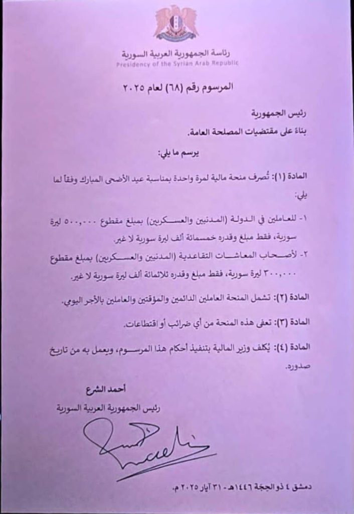أصدر الرئيس السوري أحمد الشرع اليوم المرسوم التشريعي رقم 68 لعام 2025، والذي ينص على صرف منحة مالية لمرة واحدة بمناسبة عيد الأضحى المبارك، وذلك في إطار التخفيف من الأعباء المعيشية على المواطنين.
