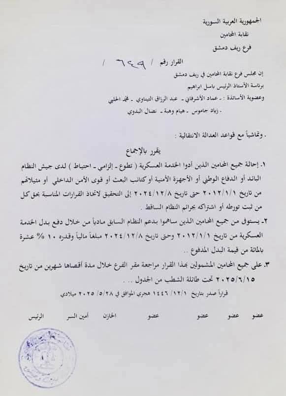 و تداول محامون في ريف دمشق وحمص قراراً صادراً عن لجنة الخمسين في فرع نقابة المحامين بريف دمشق، يحمل الرقم /694/، يتضمن إحالة جميع من أدوا الخدمة العسكرية أو الأمنية في صفوف النظام السوري، أو شاركوا في أعماله القتالية أو دعموا تلك الأعمال مادياً أو إدارياً، إلى التحقيق النقابي.