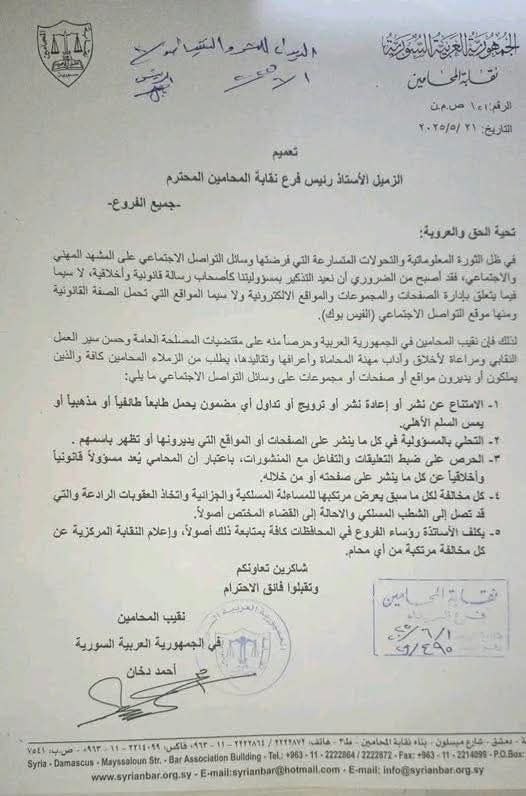 أصدرت نقابة المحامين في دمشق بيانًا حذرت فيه أعضاءها من مغبة نشر أو إعادة نشر أو الترويج لأي محتوى يحمل طابعًا طائفيًا أو مذهبيًا، أو ما من شأنه أن يُهدد السلم الأهلي في البلاد، عبر وسائل التواصل الاجتماعي.