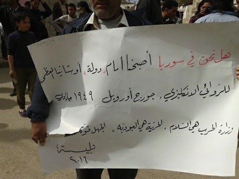 واليوم في تلبيسة في ريف حمص الشمالي. كما في داريا كما في إدلب وريفها. كما في حلب وفي مناطق أخرى.. تهدر الحناجر مجلجلة وترتفع أعلام الاستقلال فقط واللافتات تماما كما كان يحصل في جمع الثورة في سنتها الأولى. لا لشيء إلا بسبب طبيعة ما يجري منذ خمس سنوات والذي بذلت جهود جبارة من قوى محلية وإقليمة ودولية لتصويره على أنه حربا أهلية وحركة أصولية متطرفة..!