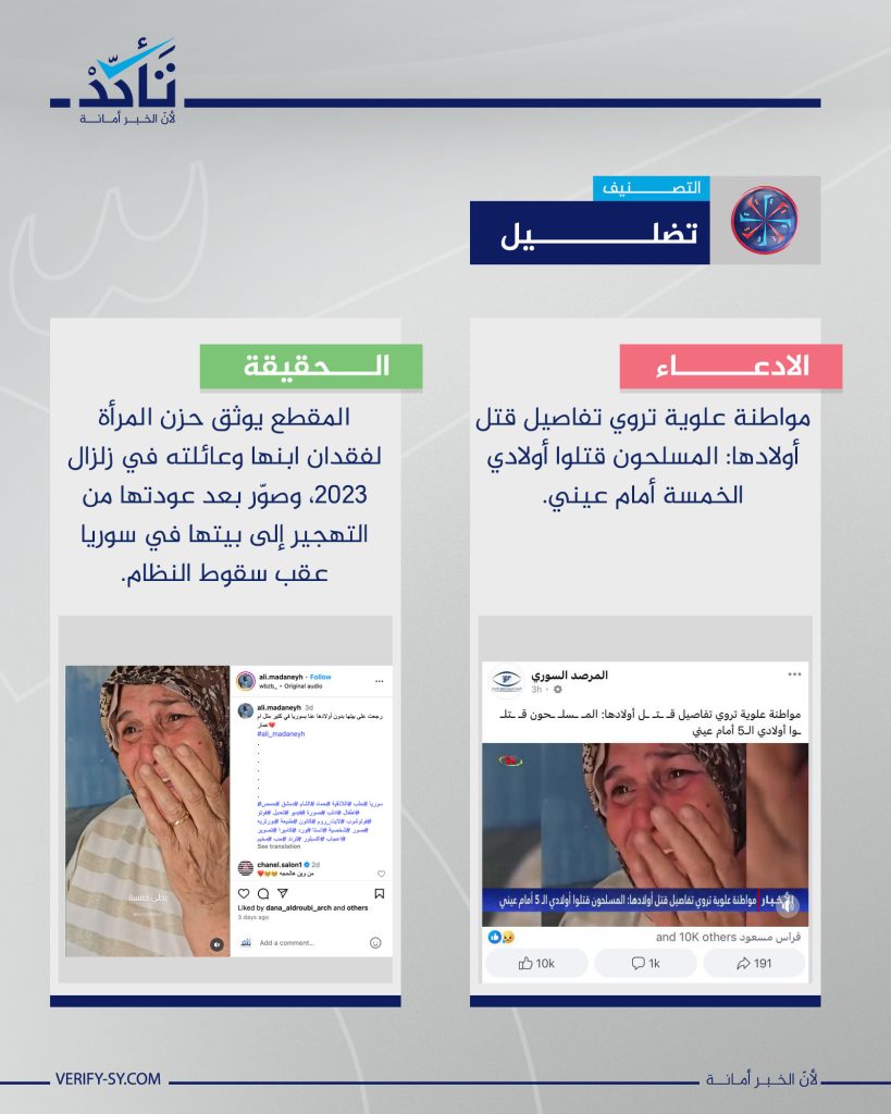 وكان الفيديو قد أظهر سيدة تبكي وتروي فقدها لأبنائها الخمسة، وادعى ناشروه أنه يوثق جريمة طائفية خلال ما سُمي بـ”الإبادة في الساحل”، إلا أن تحقيق “تأكد” أثبت أن الفيديو يعود للعام 2023، ويوثق لقاءً مع السيدة “أم عمار” من بلدة الحفة بريف اللاذقية، والتي فقدت ابنها وزوجته وأطفاله الثلاثة في الزلزال الذي ضرب جنوب تركيا وشمال سوريا، بعد تهجيرها إلى تركيا عام 2012.