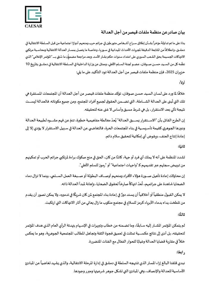 المنظمة عبّرت عن رفضها القاطع لما ورد على لسان صوفان من اعتبار “الاستقرار مقدَّمًا على العدالة”، معتبرة أن هذا الطرح يشكل “مغالطة خطيرة وفهمًا مشوّهًا لطبيعة العدالة”، مؤكدة أن العدالة ليست نتيجة تالية للاستقرار بل شرطٌ أساسي لتحقيقه.