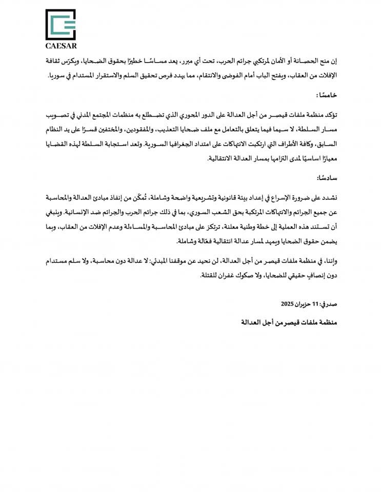 وختمت المنظمة بيانها بالتشديد على أنه “لا عدالة دون محاسبة، ولا سلم مستدام دون إنصافٍ حقيقي للضحايا، ولا صكوك غفران للقتلة”.