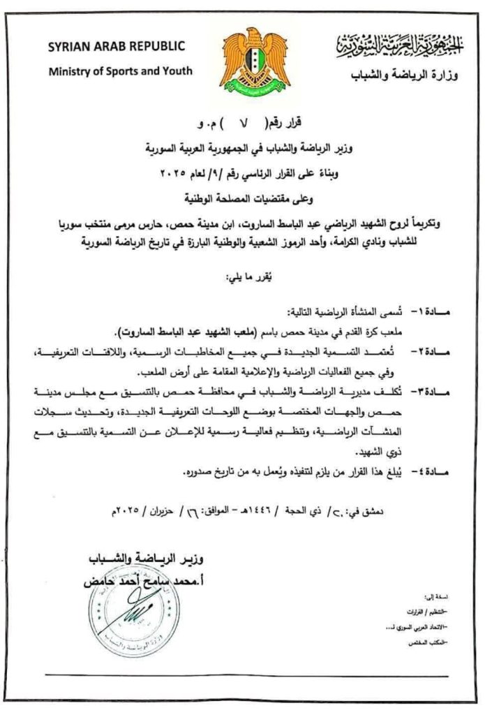 أصدر وزير الرياضة والشباب في الحكومة السورية، محمد سامح حامض، قراراً رسمياً بتغيير اسم ملعب كرة القدم في مدينة حمص إلى “ملعب الشهيد عبد الباسط الساروت”، تخليداً لاسم الحارس السابق لمنتخب سوريا للشباب ونادي الكرامة، الذي تحوّل إلى أيقونة للنضال الشعبي ضد النظام.