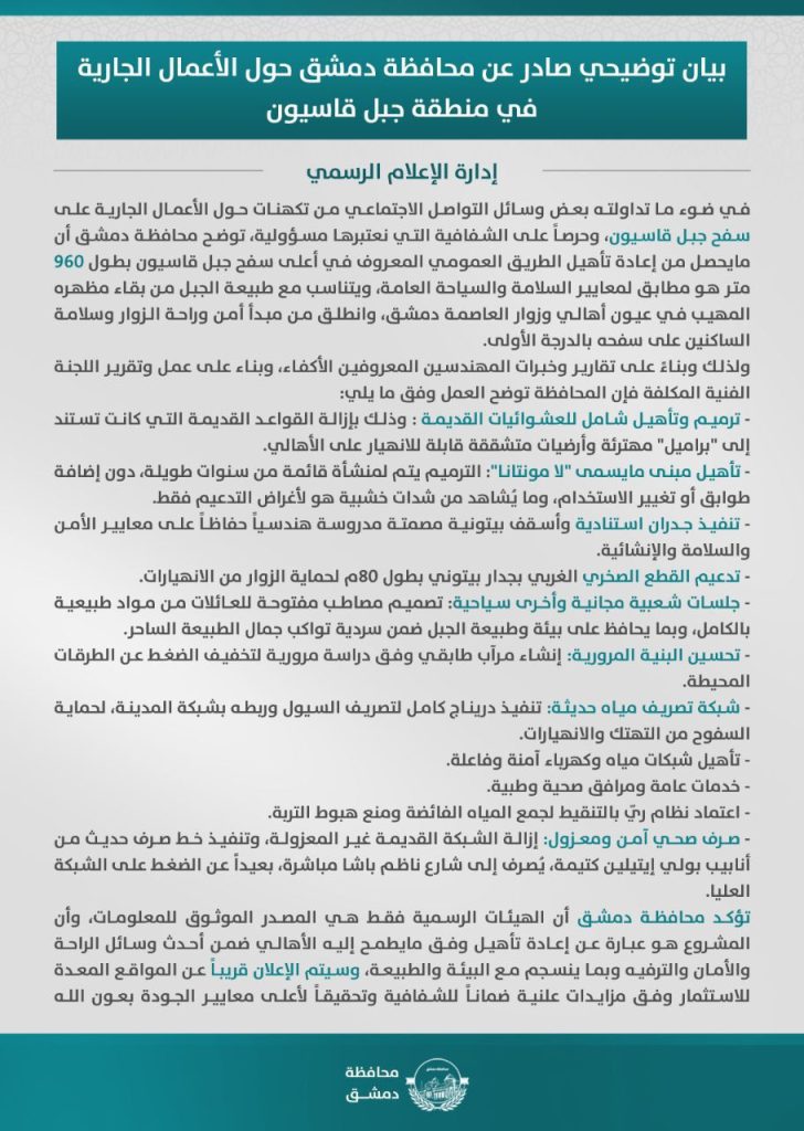 وأكدت محافظة دمشق، في بيان رسمي نُشر على قناتها عبر تطبيق “تلغرام”، أن المعلومات المتداولة على وسائل التواصل الاجتماعي حول المشروع “غير دقيقة”، مشددة على أن الهدف من المشروع هو إعادة تأهيل الطريق العمومي على قمة الجبل، ومعالجة العشوائيات بما يضمن سلامة وأمان الزوار والسكان.
