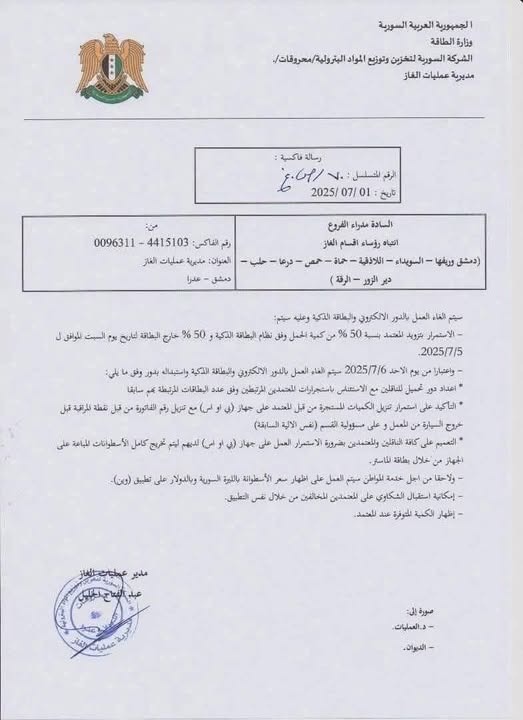 أعلنت الشركة السورية لتخزين وتوزيع المواد البترولية – محروقات، إلغاء نظام الدور الإلكتروني والبطاقة الذكية لتوزيع الغاز المنزلي، بدءاً من الأحد 6 تموز 2025، واستبداله بآلية جديدة تعتمد على المعتمدين والناقلين لتنظيم عمليات التوزيع.