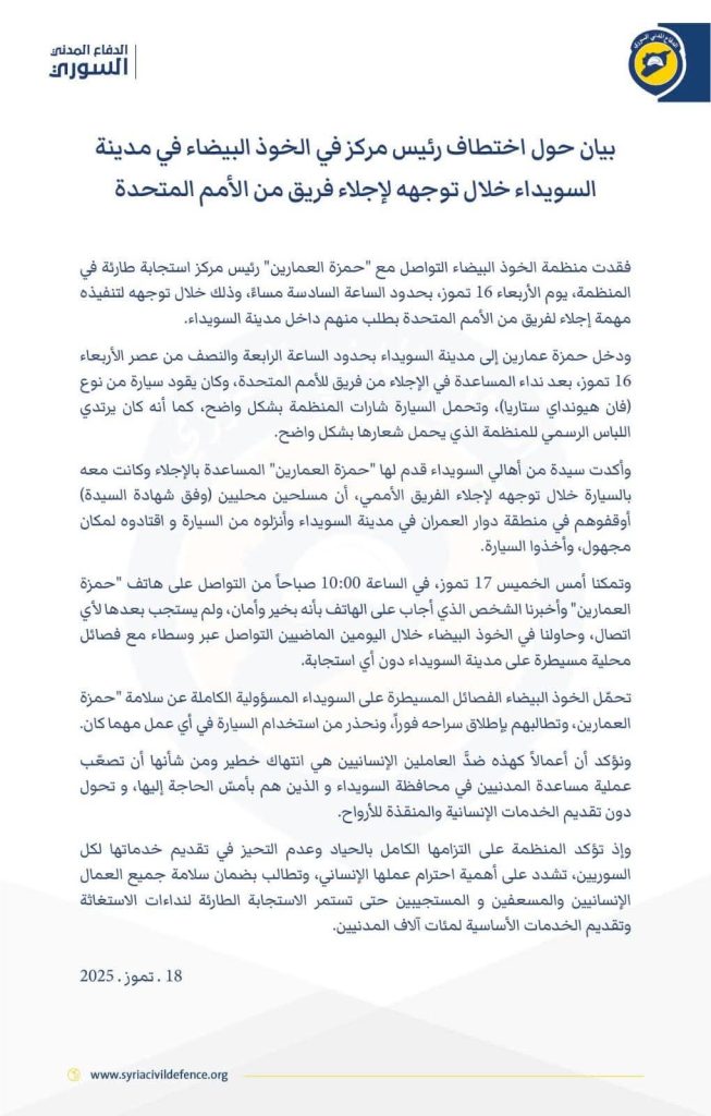 أعلنت منظمة “الخوذ البيضاء” عن فقدان التواصل مع رئيس مركزها في مدينة السويداء، حمزة العمران، مساء الأربعاء 16 تموز، خلال استجابته لنداء طارئ من الأمم المتحدة لتنفيذ مهمة إنسانية داخل المدينة.