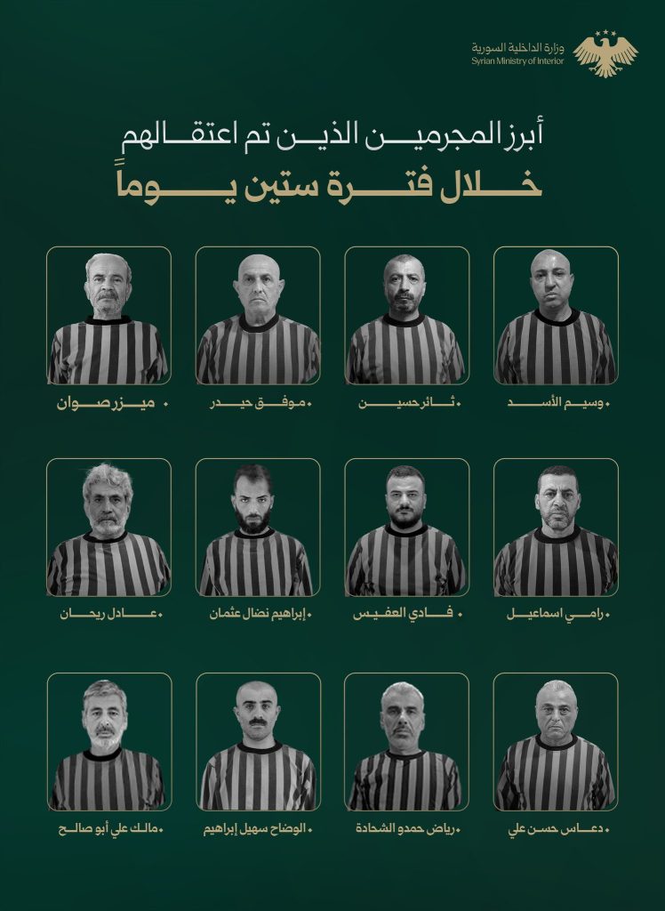 أعلنت مديرية الأمن الداخلي في محافظة اللاذقية عن توجيه “ضربات موجعة لفلول النظام المخلوع” خلال الأيام الماضية. تمكنت المديرية من إلقاء القبض على قائد ما يُعرف بـ”غرفة عمليات الساحل” وضبط شبكة أخرى على صلة بـماهر الأسد، شقيق رئيس النظام المخلوع.