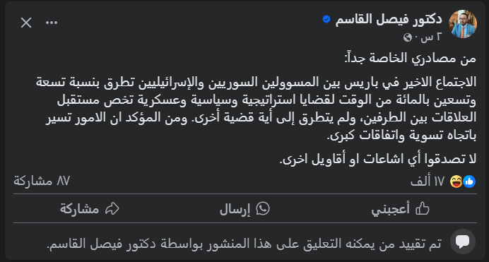 كشف الإعلامي فيصل القاسم، نقلاً عن “مصادر خاصة جداً”، في منشور على صفحته الرسمية، أن الاجتماع الأخير الذي عُقد في باريس بين مسؤولين سوريين وإسرائيليين ركز بنسبة “تسعة وتسعين بالمائة من الوقت” على قضايا استراتيجية وسياسية وعسكرية تخص مستقبل العلاقات بين الطرفين.