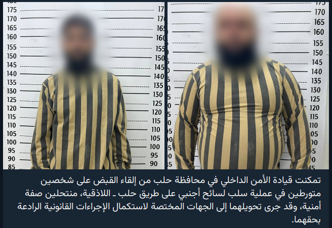 أعلن قائد الأمن الداخلي في محافظة حلب، العقيد محمد عبد الغني، أن الأجهزة الأمنية تمكنت من إلقاء القبض على شخصين قاما بسلب سائح أجنبي على طريق حلب ـ اللاذقية، بعد انتحالهما صفة أمنية.