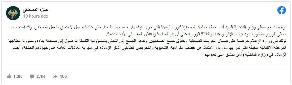 وقد أكد وزير الإعلام حمزة مصطفى، عبر منصة “X”، أن التوقيف جاء “على خلفية مسائل لا تتعلق بالعمل الصحفي”، مشيراً إلى استجابة وزير الداخلية المهندس أنس خطاب لتوصيات وزارة الإعلام.