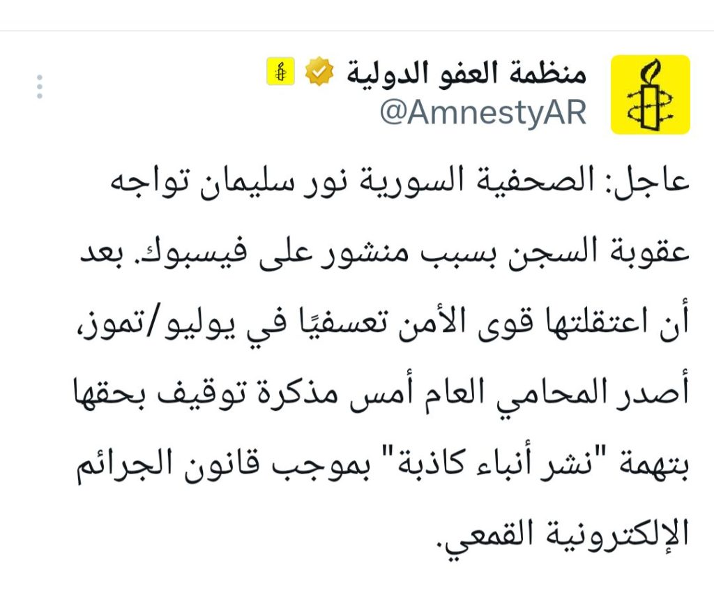 Une fausse information circule, affirmant que la journaliste syrienne Nour Sleiman risquerait la prison suite à une publication sur Facebook. Selon cette rumeur, elle aurait été arrêtée arbitrairement en juillet et un mandat d’arrêt aurait été émis à son encontre pour “diffusion de fausses nouvelles”. Ces allégations sont infondées.