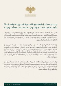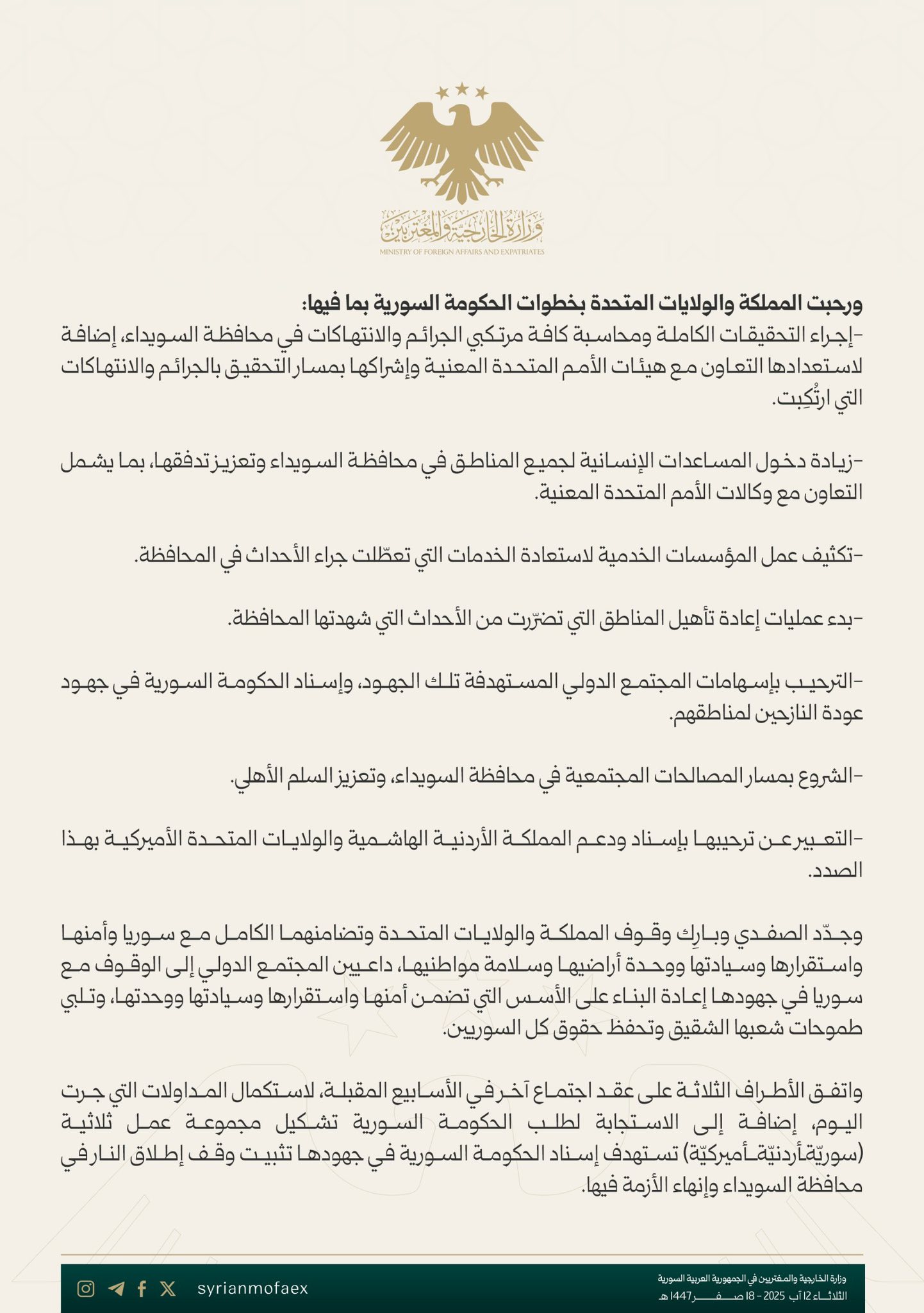 رحبت كل من الأردن والولايات المتحدة بالخطوات التي اتخذتها الحكومة السورية لمعالجة الأزمة في السويداء، والتي شملت: